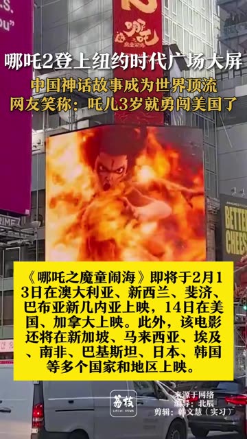 46次播放 | 00:52【哪吒2登上纽约时代广场大屏 中国神话故事成为世界顶流 网友笑称:哪吒3岁就勇闯美国了】2月6...