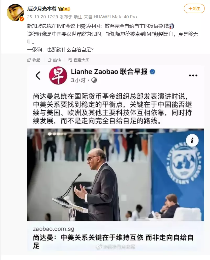 新加坡总统在IMF会议上喊话中国:放弃完全自给自足的发展路线