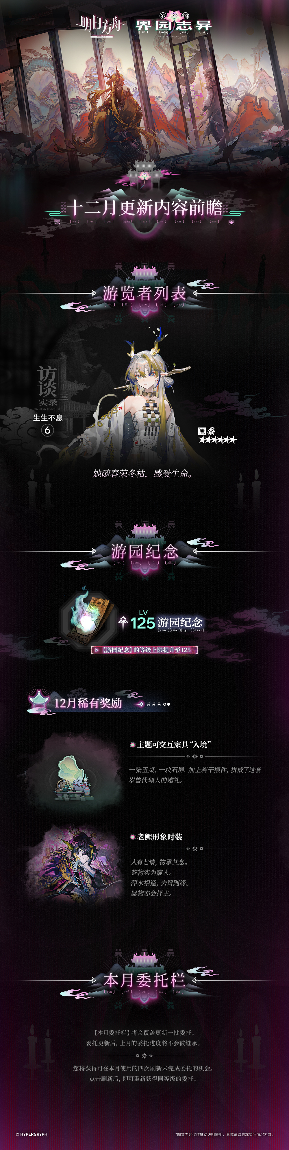 ◆ 【游览者列表】本月【游览者列表】:黍◆ 【游园纪念】【游园纪念】的等级上限提升至125。本月稀有奖励:主题可交互家具“入境”老鲤形象时装◆ 【本月委托栏】【本月委托栏】将会覆盖更新一批委托。委托更