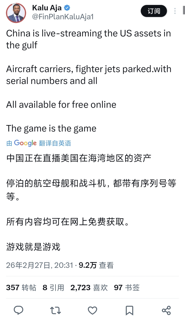 美军似乎对中国网路直播伊朗战况感到很不舒服