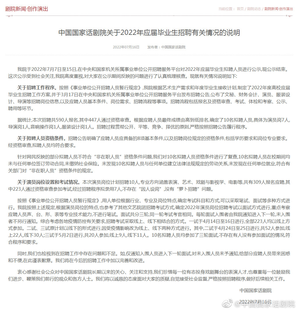 中国国家话剧院回应:招聘易烊千玺合法合规,符合程序和要求