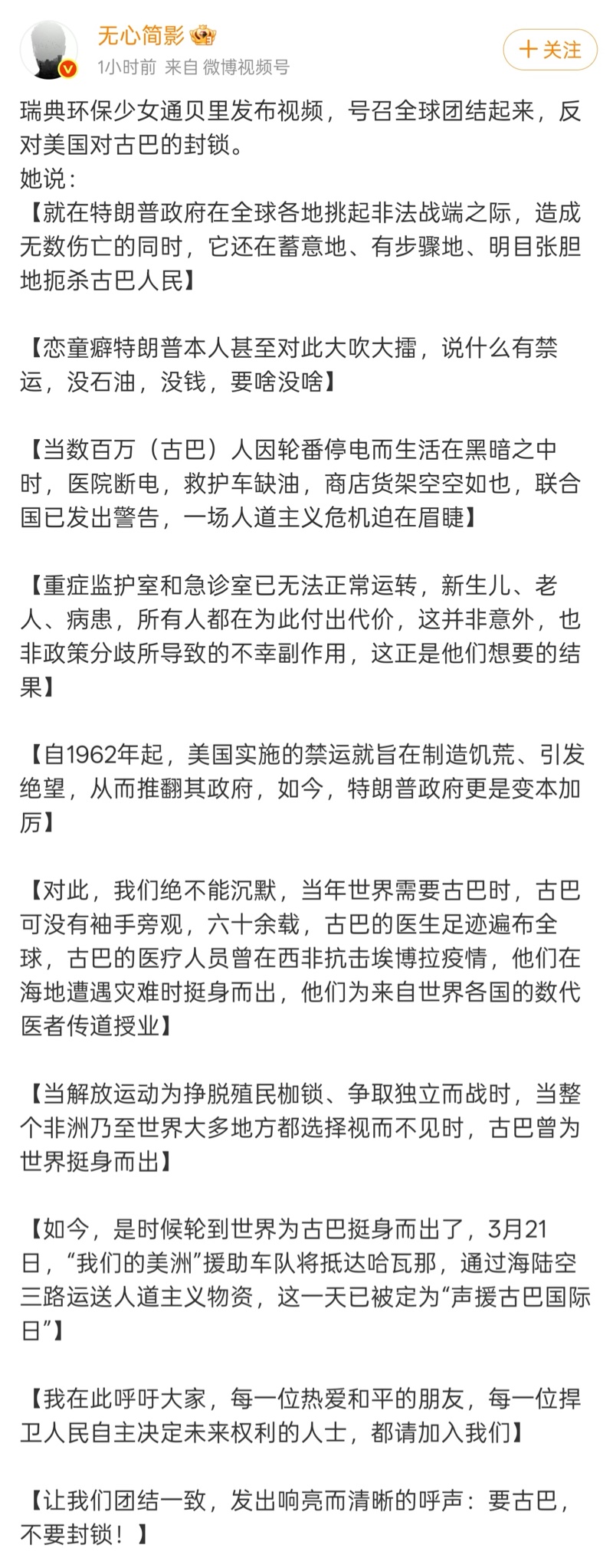 环保少女号召全球团结起来反对美国封锁古巴