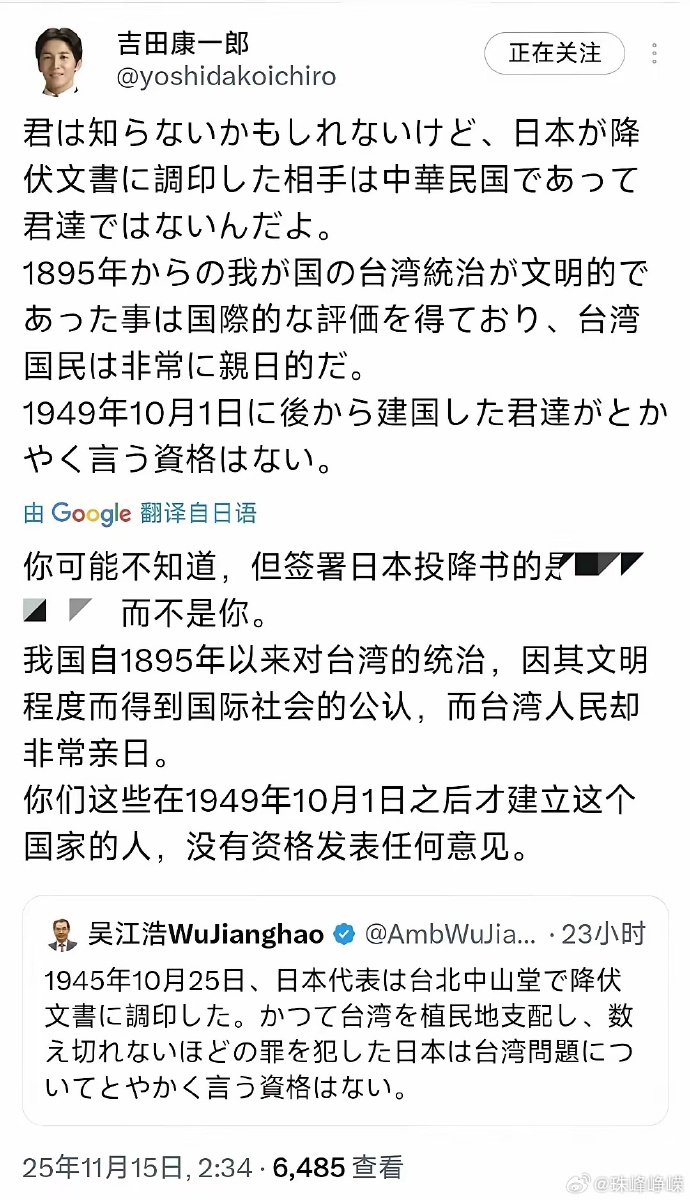 日本议员在社交媒体公然发声:新中国没签投降文书,没资格发表意见。当地时间15日,日本右翼议员吉田康一郎在社媒上公然声称,日本对台湾省的殖民统治得到了国际公认,而新中国没有签署投降文书,所以没有资格发表