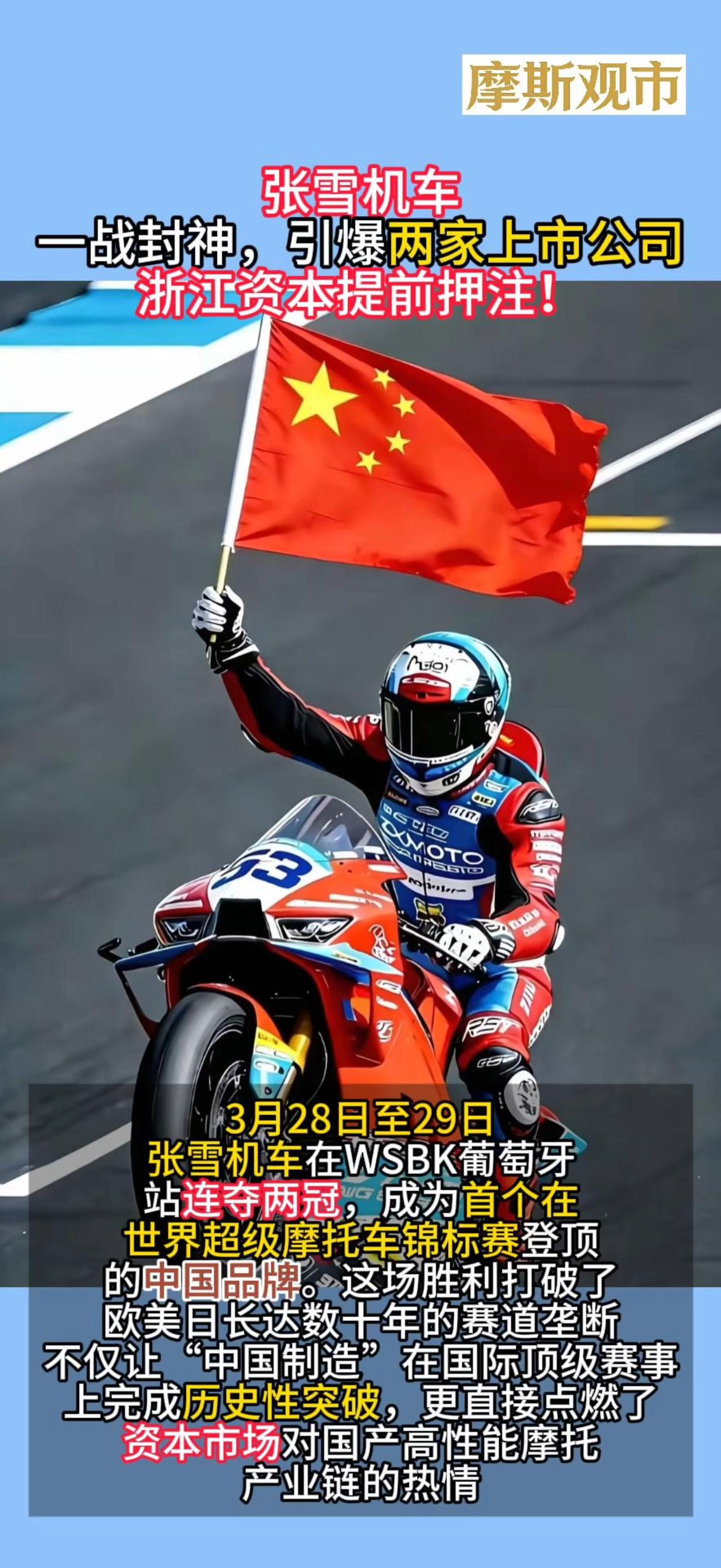 张雪机车创造历史,拿下WSBK葡萄牙站赛冠军