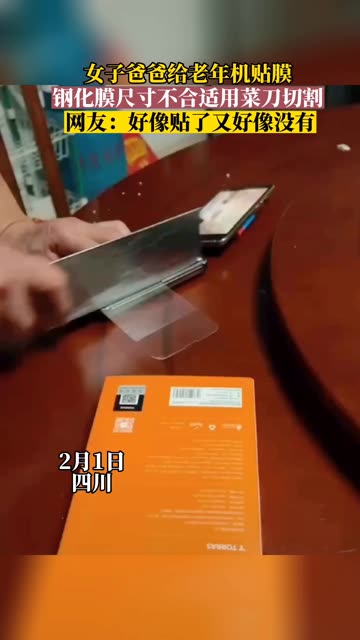 • 女子爸爸给老年机贴膜,膜大小不合适,用菜刀切割。
