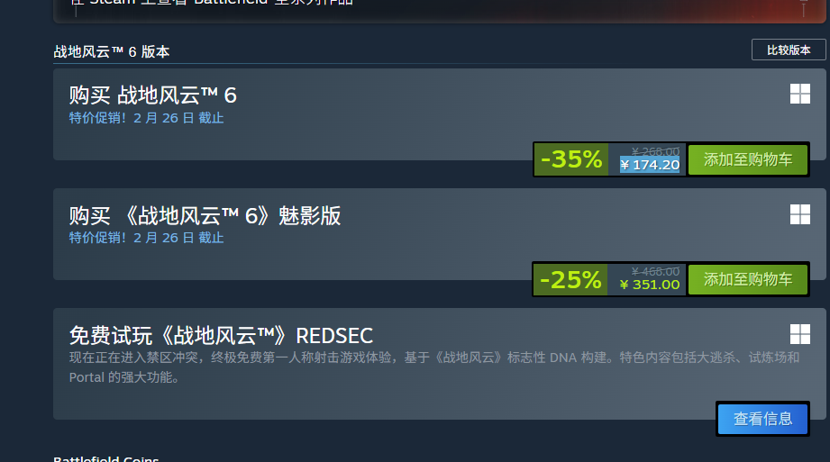 第一人称射击大作《战地风云6》,当前在Steam平台的国区售价为¥ 174.20元(-35%折扣),Steam国区标准版原价为268元.本作由EA及Battlefield Studios开发,采用最新