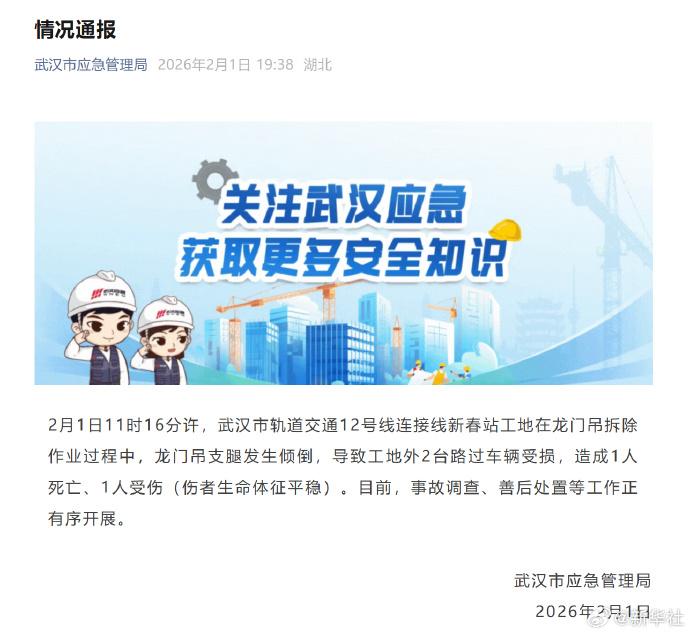 来源:新华社、潇湘晨报、大风新闻、新民晚报2月1日11时16分许,武汉市轨道交通12号线连接线新春站工地在龙门吊拆除作业过程中,龙门吊支腿发生倾倒,导致工地外2台路过车辆受损,造成1人死亡、1人受伤(