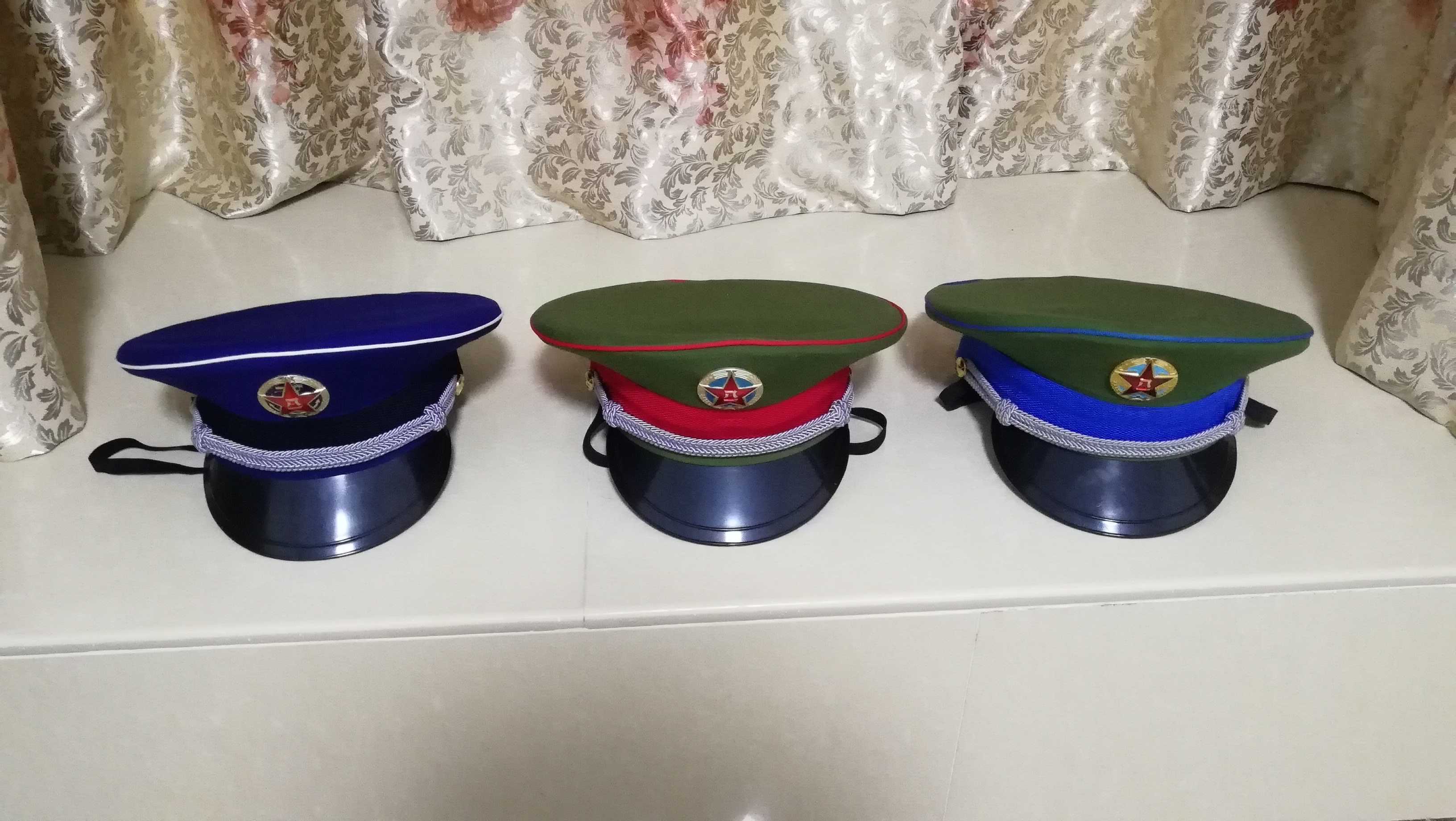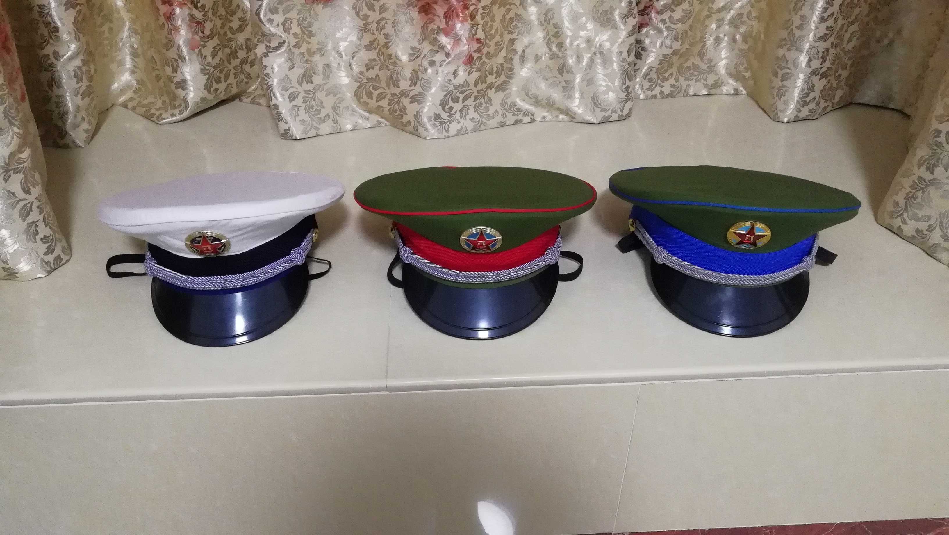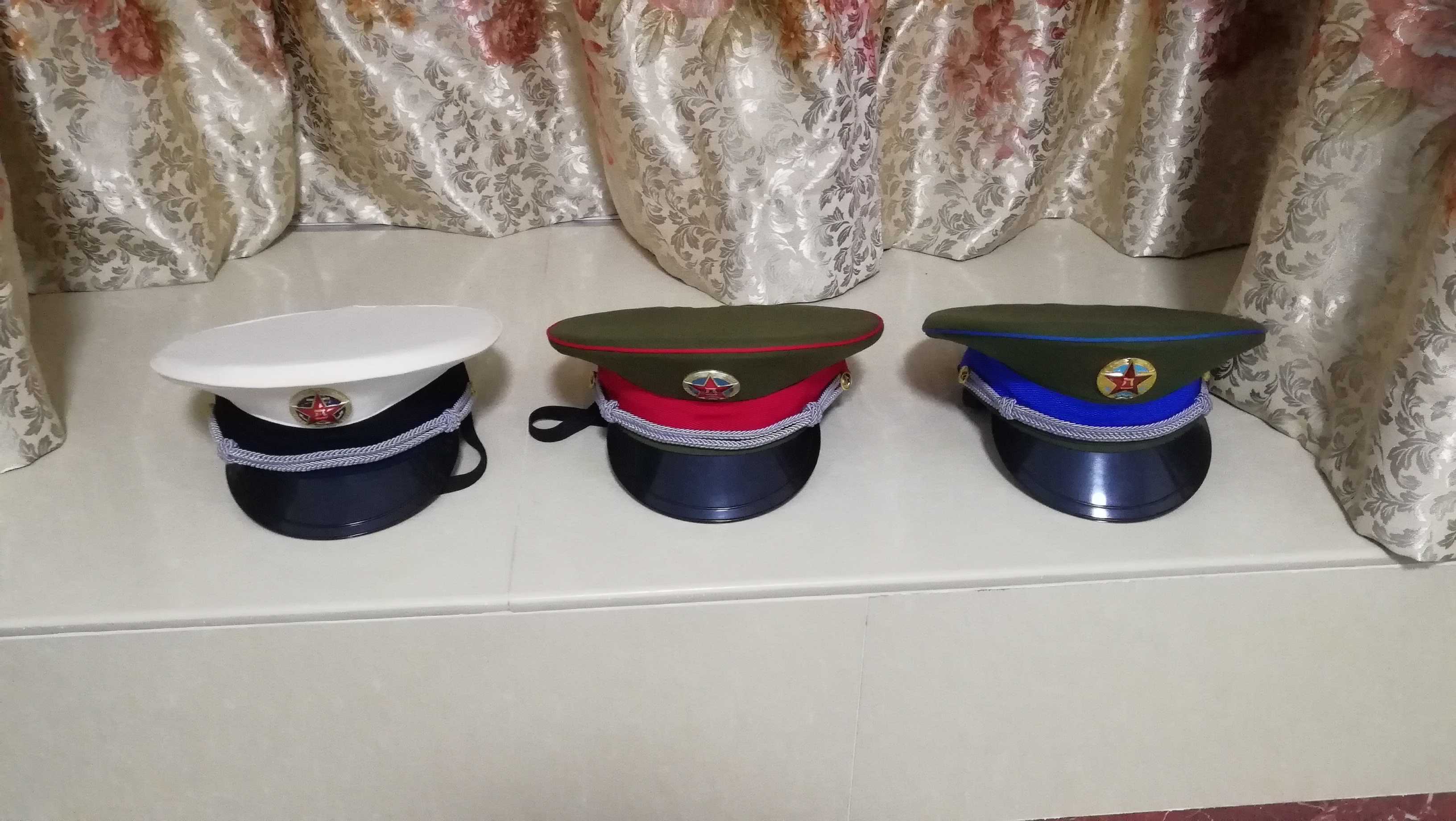 2020年拍摄分别为校官大檐帽、尉官大檐帽、军官大檐帽、士官大檐帽、士兵大檐帽、水兵帽和两团一队大檐帽