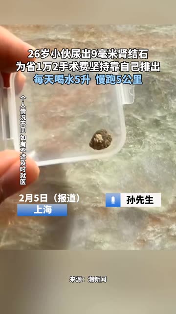0次播放 | 00:1626岁小伙尿出9毫米肾结石 为省1万2手术费坚持靠自己排出 每天喝水5升 慢跑5公里