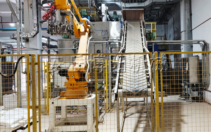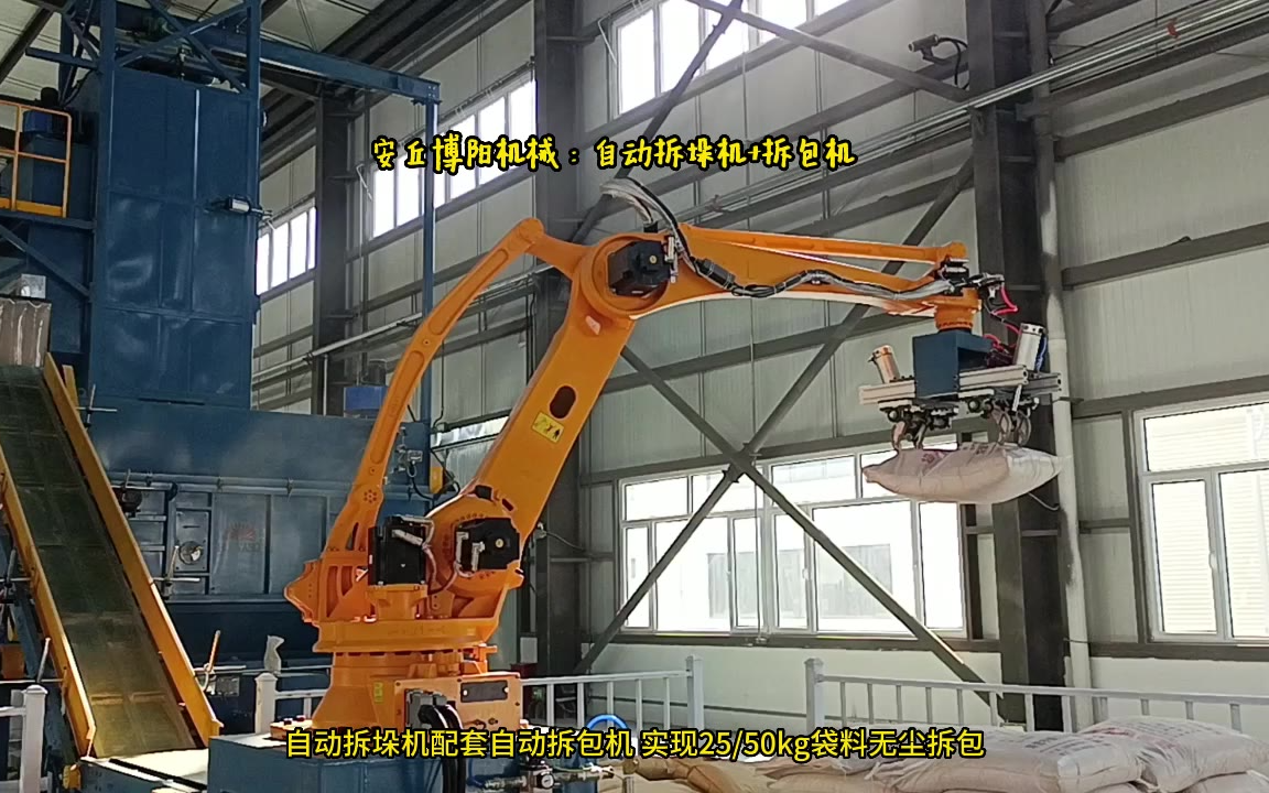 0次播放 | 00:31化肥原料自动拆包机器人 全自动拆包机现场案例