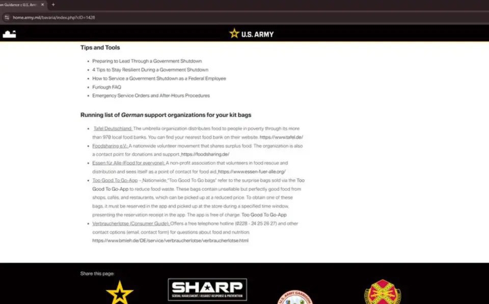 据美巴伐利亚驻军在其官网发布的美陆军指南显示,军方建议驻德士兵寻求紧急社会援助,包括申请贷款、德国饭桌、食物共享协会、人人有饭、Too Good To Go袋子(低价处理商超卖不掉的食物销售平台)等慈