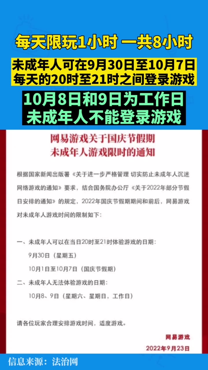82次播放 | 02:42一天限玩一小时!国庆假期未成年人游戏限玩通知来了→
