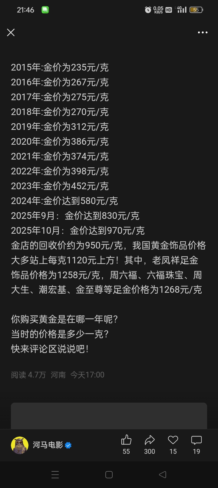 我们10年结婚的时候金价285买了(杂牌的,戒指耳环项链共十克,15年怀了我大女儿买了周大福的十克的一条项链加手工费410/克,19年换了老凤祥的一戒指一耳钉(把结婚的戒指耳环项链加一起还补了?千多)