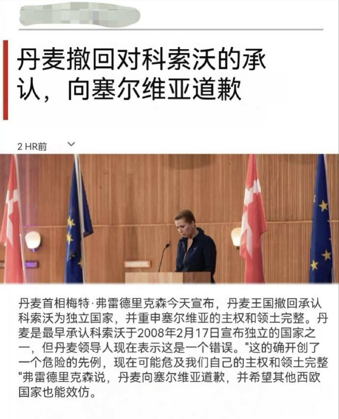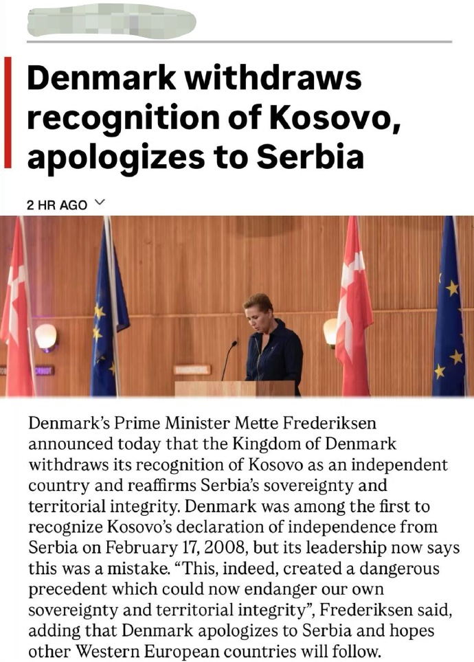 丹麦首相梅特·弗雷德里克森于2026年1月11日正式宣布撤回对科索沃独立的承认,并向塞尔维亚道歉,称此举是纠正2008年承认科索沃独立的历史错误,并重申支持塞尔维亚主权和领土完整。
