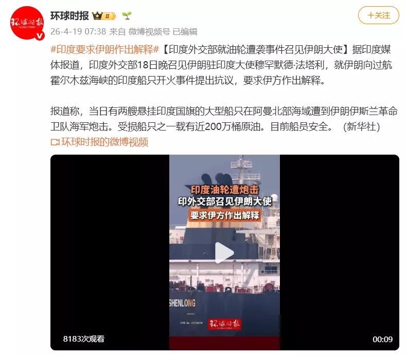据印度媒体报道,印度外交部18日晚召见伊朗驻印度大使穆罕默德·法塔利,就伊朗向过航霍尔木兹海峡的印度船只开火事件提出抗议,要求伊方作出解释。报道称,当日有两艘悬挂印度国旗的大型船只在阿曼北部海域遭到伊