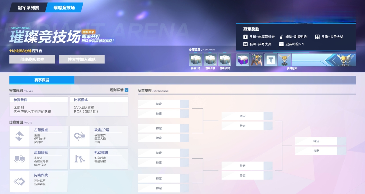 守望先锋全新5V5赛事“璀璨竞技场”下周2月7日开打,比赛由预赛、半决赛、决赛三轮构成。8支队伍采取三局两胜单败赛制,包含挑选地图及禁用英雄的环节。完赛1场就可以获得一个补给箱,冠军奖励如图所示。玩家