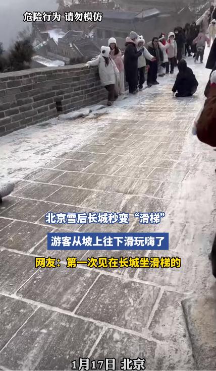2026年1月17日,北京初雪如约而至,八达岭长城披上银装,宛如一条盘踞山脊的“银色巨龙”。这场雪不仅带来了诗意的风景,也催生了一种奇特的游览方式——游客在积雪湿滑的城墙上“一呲溜”滑下陡坡,被网友戏