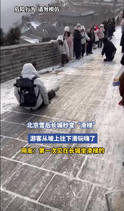 雪后长城秒变滑梯,这场雪不仅带来了诗意的风景,也催生了一种奇特的游览方式!