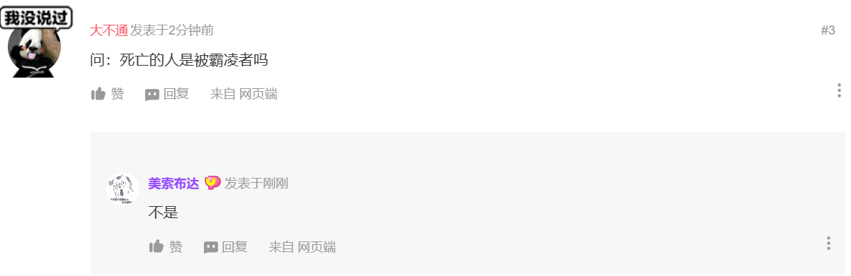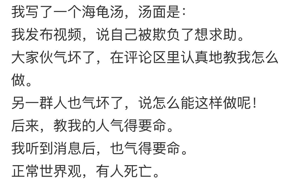 龟汤:我发布视频,说自己被欺负了想求助。大家伙气坏了,在评论区里认真地教我怎么做。另一群人也气坏了,说怎么能这样做呢!后来,教我的人气得要命。我听到消息后,也气得要命。正常世界观,有人死亡。感谢以下参