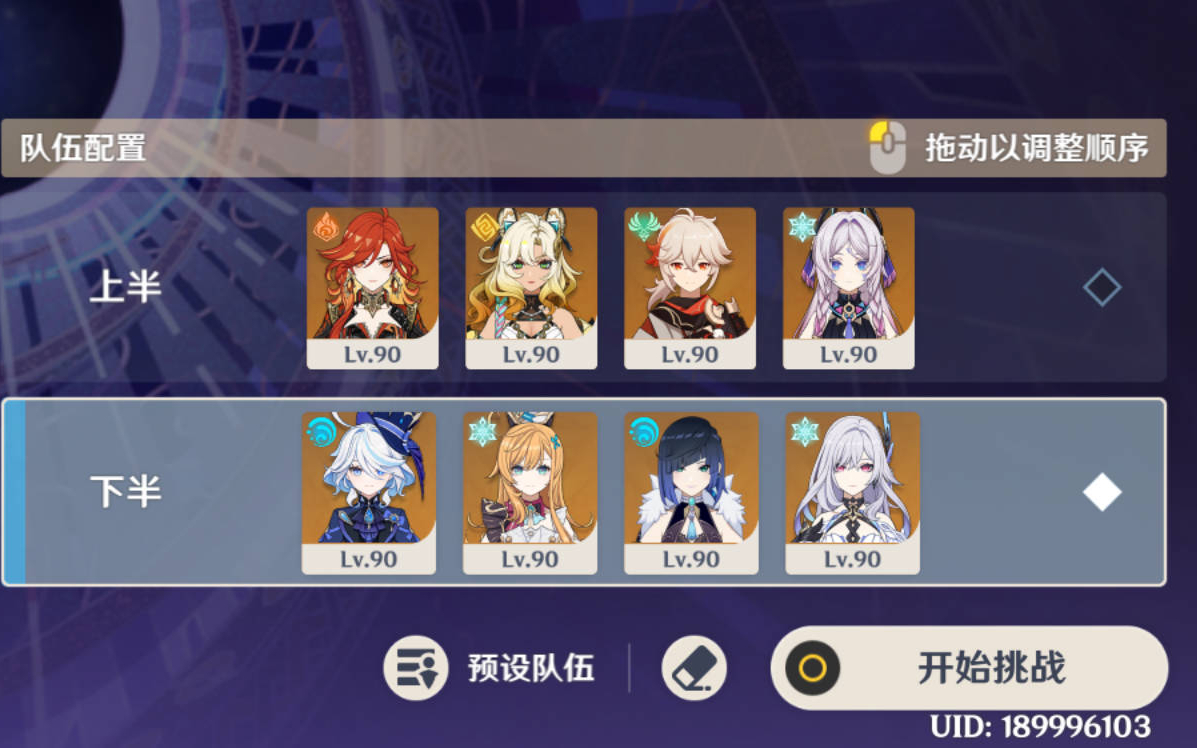 大概说一下以前的打法,基本每一期都是固定的,上半是琴+胡桃+夜兰+钟离,最近把琴换成行秋了...下半是凌人固定,其他的稍有些不固定,但基本是七七+甘雨+雷电将军+诺艾尔之类的样子。班尼特啥的一次都没用
