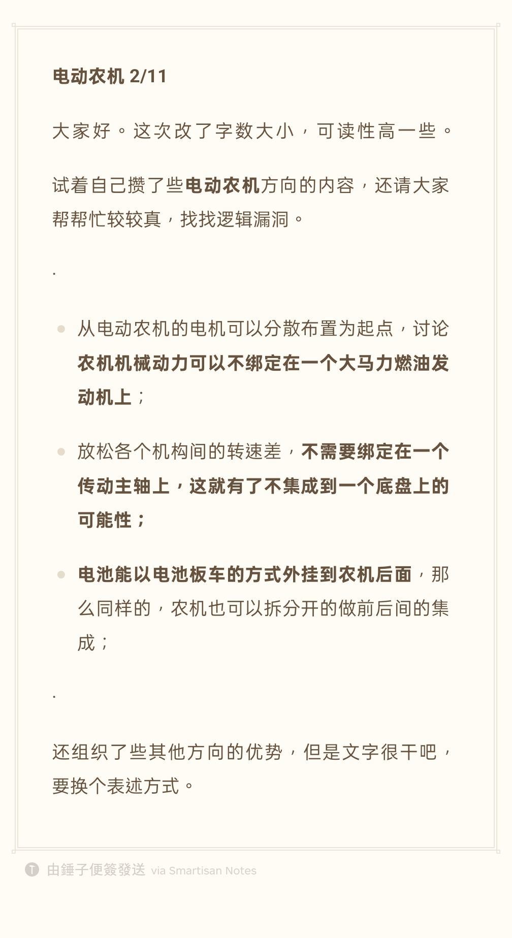这次改了字数大小,对大家的眼睛友好些。·给电动汽车退役的二手电池,寻求在电动农机方向的梯次利用空间;电池装在板车上拖在农机后面,以这种外挂供能方式来容纳各家电池尺寸和电池外包形状的不同。
