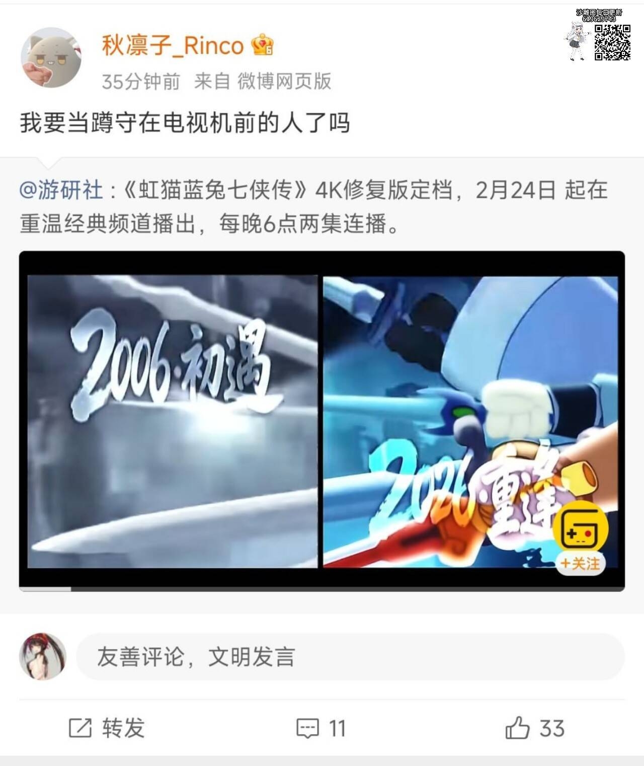 《虹猫蓝兔七侠传》4K修复版正式定档!2月24日(年初八)起,每晚18:00于国家广电总局指导、中国广电主办的「重温经典」频道播出,每日两集连播。《虹猫蓝兔七侠传》于2006年9月5日在中央电视台少儿