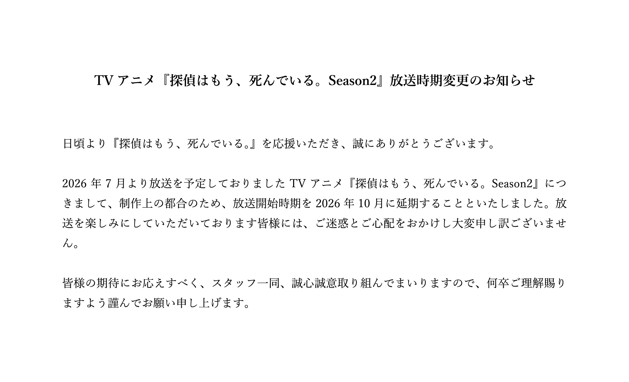 原定于 7 月播出的电视动画《侦探已死 第二季》因制作原因宣布延期至 10 月开播。【STAFF】导演:栗原学系列构成:赤尾でこ角色设计:伊藤陽祐动画制作:ENGI【CAST】君塚君彦:長井新シエスタ