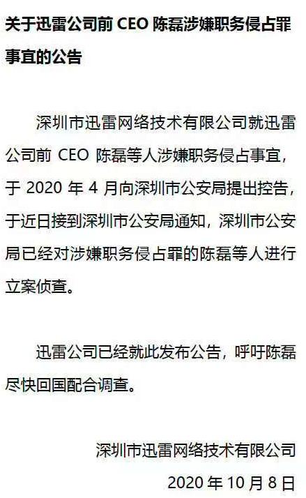 来源:新浪新闻、红星新闻、千龙网1月15日,据相关人士爆料,迅雷正式起诉前ceo陈磊,指控其侵害公司利益。记者就此问询迅雷相关员工,对方表示确有此事,目前深圳相关法院已受理。这一则起诉,也让五年前轰动