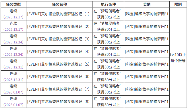 《艾尔之光》将于12月17日开启艾尔搜查队的噩梦逃脱记活动,通过活动可以获得专属饰品哦,不要错过!活动时间:2025年12月17日例行维护后-2026年1月14日例行维护前活动一:艾尔搜查队的噩梦逃脱