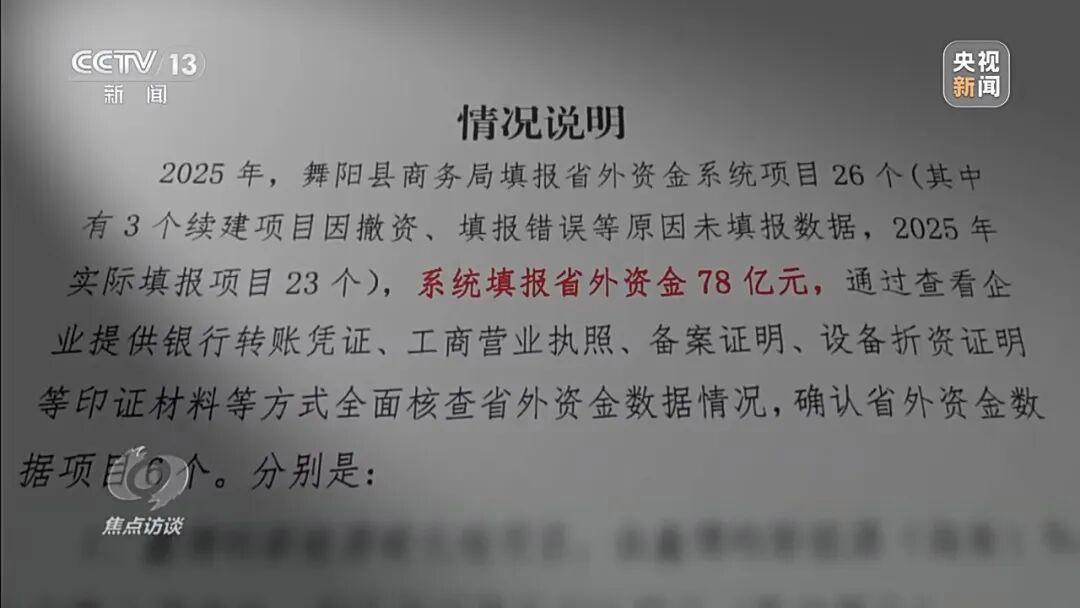 来源:央视新闻、焦点访谈近日,记者在河南调查发现,一些区县在统计引进省外资金工作中,由于上级考核层层加码,只重指标不重核查,为了完成任务,基层单位虚构项目、编造数据,严重违背实事求是原则。那么这些虚假