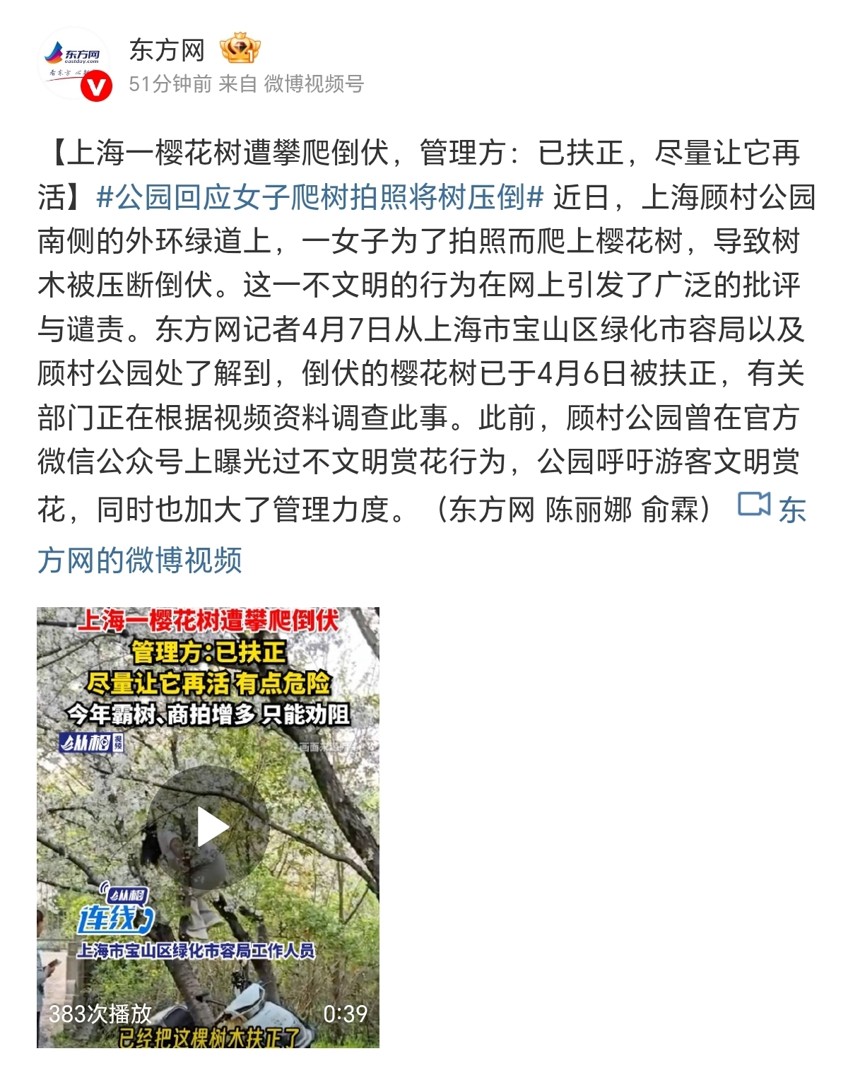 公园回应女子爬树拍照将树压倒