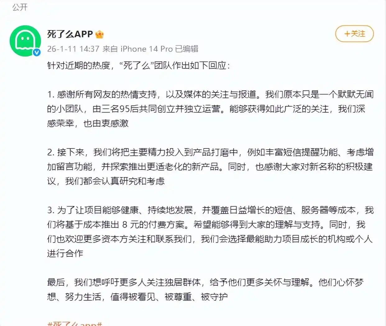 红星新闻针对近期的热度,“死了么”团队作出如下回应:1. 感谢所有网友的热情支持,以及媒体的关注与报道。我们原本只是一个默默无闻的小团队,由三名95后共同创立并独立运营。能够获得如此广泛的关注,我们深