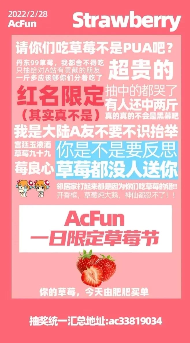还是老样子,评论写下你想送草莓的up主,抽两个肥肥,肥肥跟肥肥提名的up一人一份草莓要求:可爱的肥肥今年帮我们屯口的凰裳冲一下万粉吧要求关注 @Twinkle_凰裳 https://www.acfun