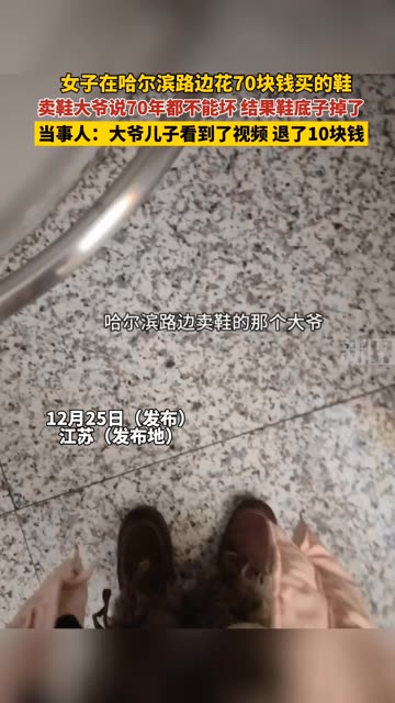 163次播放 | 00:06女子在哈尔滨路边花70块钱买的鞋,卖鞋大爷说70年都不能坏 结果鞋底子掉了,当事人:大爷儿子看...