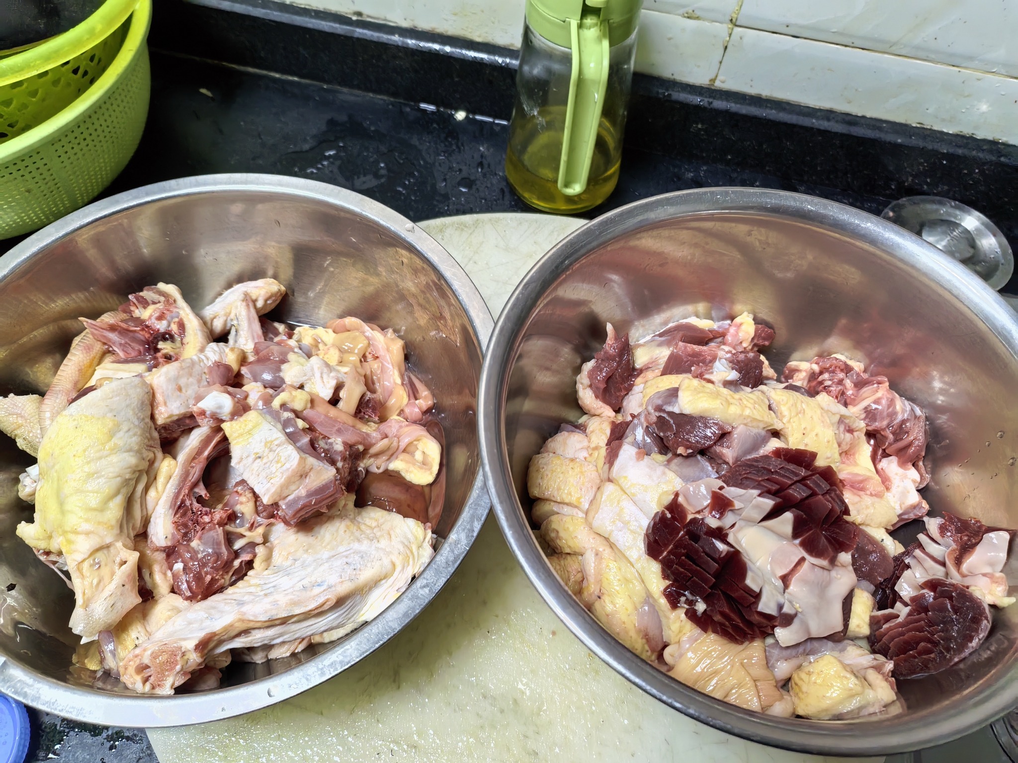 老人生日,老表说周末聚个餐,家里两娃上补习班,老表家孩子们上班啥的要从别的乡镇回来,大家都在努力的赶路,晚一点无所谓,重要的是人齐。。9点,大家到齐,上菜开饭~首先,无鸡不成宴的白切家养阉鸡!煮白切鸡
