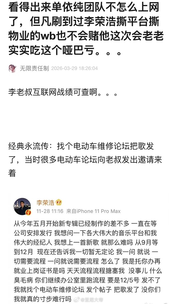 来源:每日经济新闻3月28日,单依纯演唱会在深圳举行,其间她翻唱歌曲《李白》。3月29日下午,李荣浩公开喊话单依纯,称对方在李荣浩方婉拒翻唱授权的情况下,强行侵权演唱《李白》,并直言单依纯不要甩锅给公