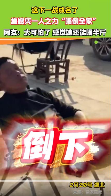 近日,在湖北恩施的一场家庭聚会上,一位平时不显山不露水的堂嫂意外化身“酒神”,竟独自喝倒了家中姑父、表哥、堂哥、妹夫和侄子。五人全都跑去睡觉了,只有堂嫂像没事人一样,面带微笑坐在门口,悠闲地嗑着瓜子。