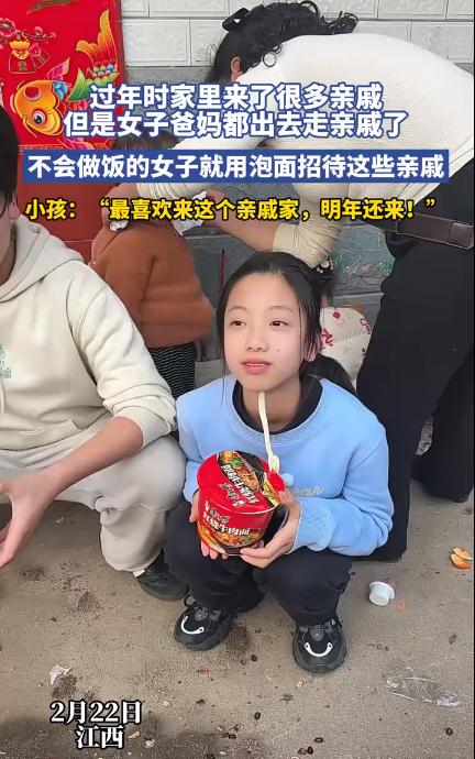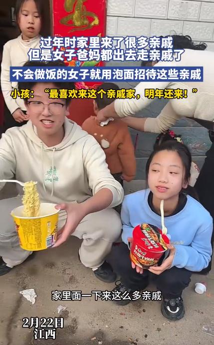 2月22日,江西一女子因过年家里来了很多亲戚,但其爸妈都出去走亲戚了,不会做饭的女子就用泡面招待这些亲戚,小孩:最喜欢来这个亲戚家,明年还来! 据当事人介绍,当天家里突然来了一群亲戚,但爸妈都不在家