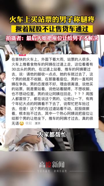 26次播放 | 00:36火车上买站票的男子称腿疼,撅着屁股不让售货车通过,拍摄者:最后大姐把座位让给男子才解决。 ...