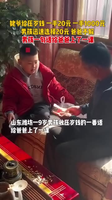 41次播放 | 00:16姥爷给压岁钱 一手20元 一手1000元,男孩迅速选择20元。 爸爸不解,男孩一句话给爸爸上了...