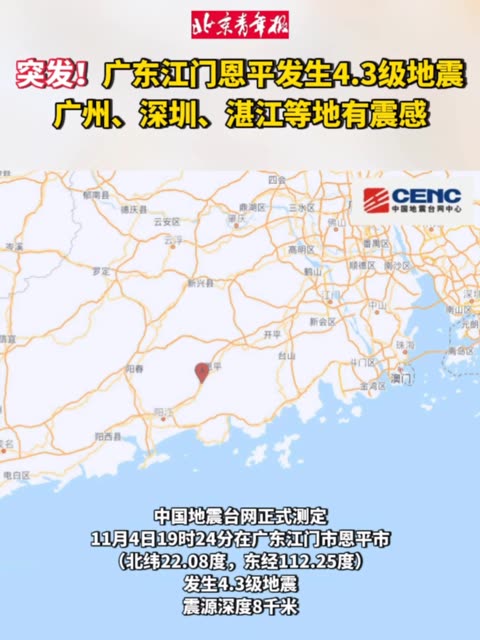 中国地震台网正式测定:11月04日19时24分在广东江门市恩平市(北纬22.08度,东经112...