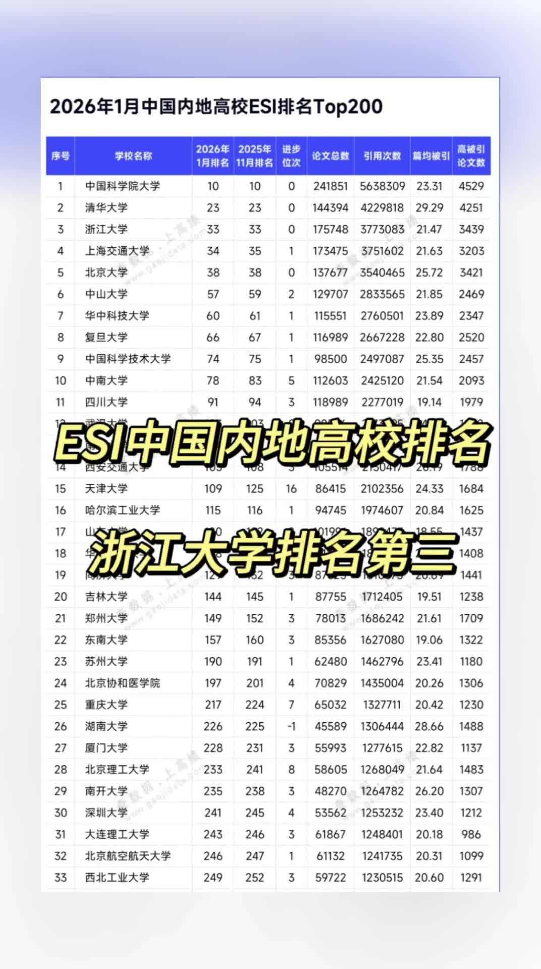 中国内地高校ESI最新排名,浙江大学排第三(2026年1月)