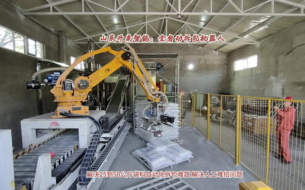 0次播放 | 00:29袋装碱粉全自动拆包机器人 机械手自动拆包机械手优势