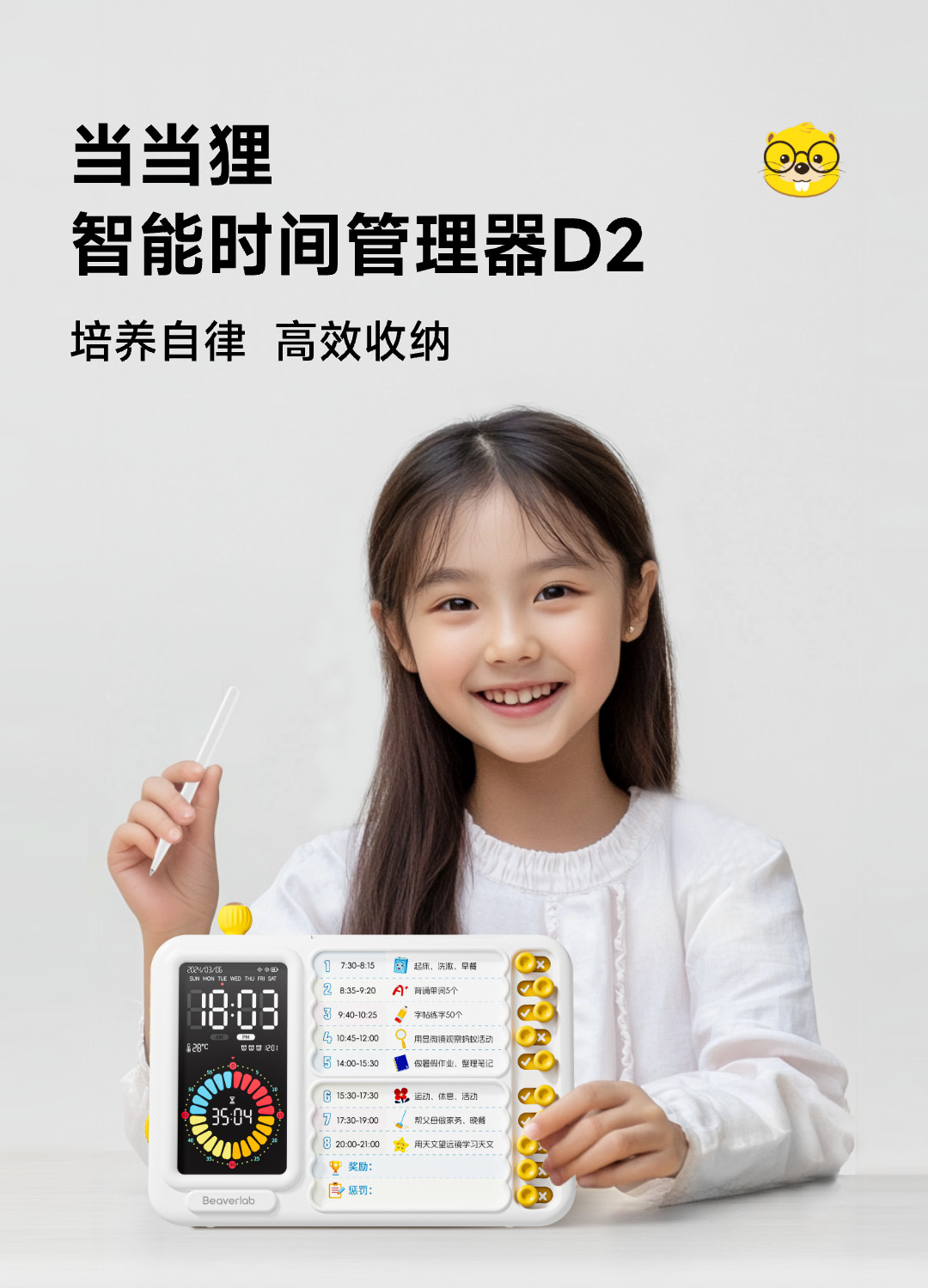 一、实体自律工具:1.当当狸(beavelab)可视化时间管理器D2(3-60 岁,129元起)产品名称:当当狸时间管理器产品型号:DDL-D2主要材质:ABS、硅胶、电子元器件性能特点:超大彩屏,人