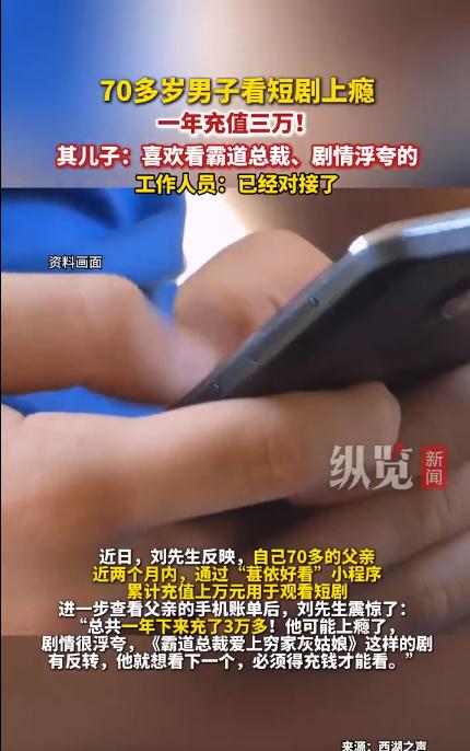 “霸道总裁爱上我”、“豪门弃妇逆袭”……节奏快、反转多的微短剧,成为不少人的“电子榨菜”,其中不乏老年群体,随之而来的投诉也层出不穷。看“霸道总裁”上瘾,七旬老人一年充值三万刘先生向西湖之声反映,自己