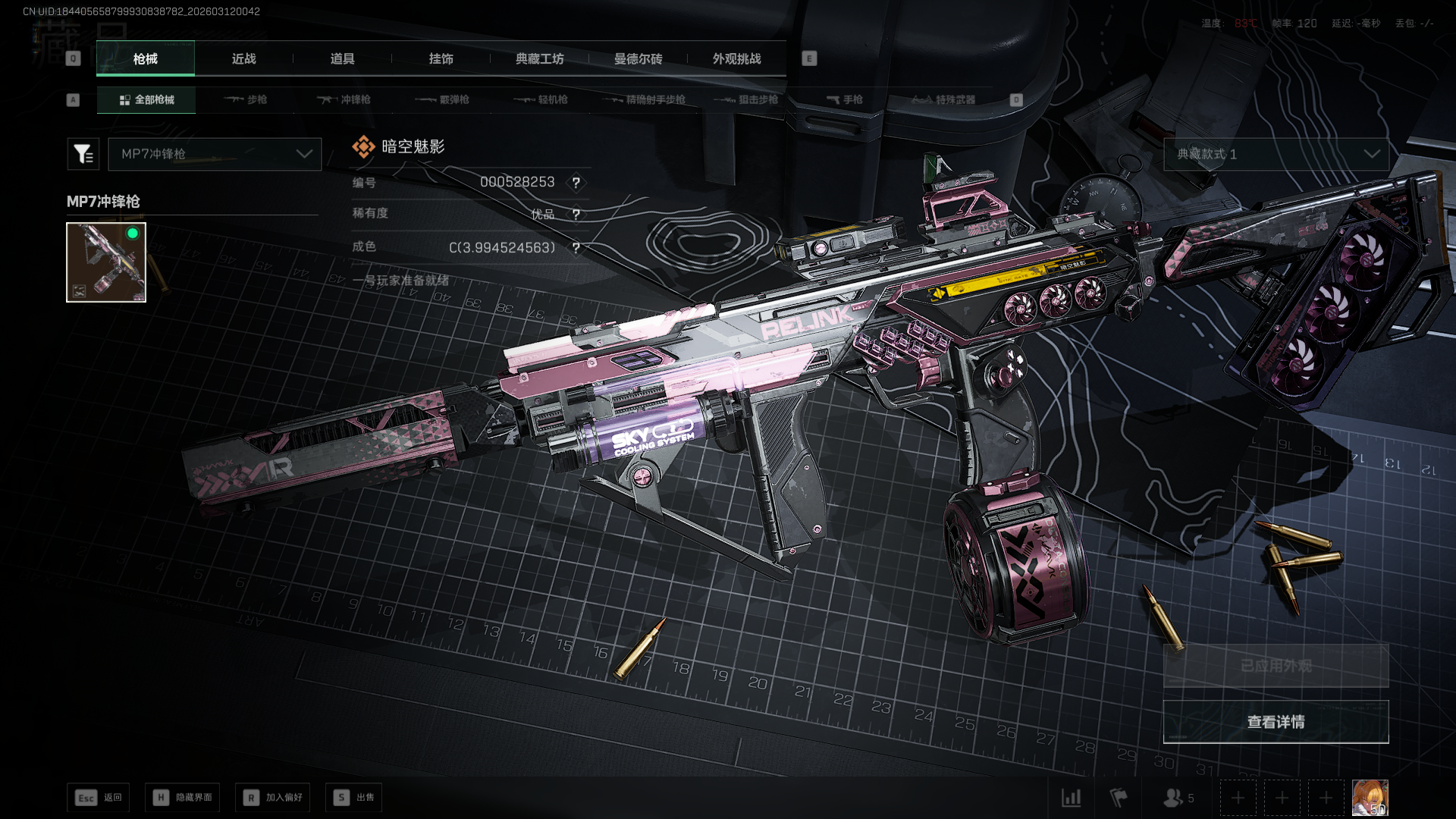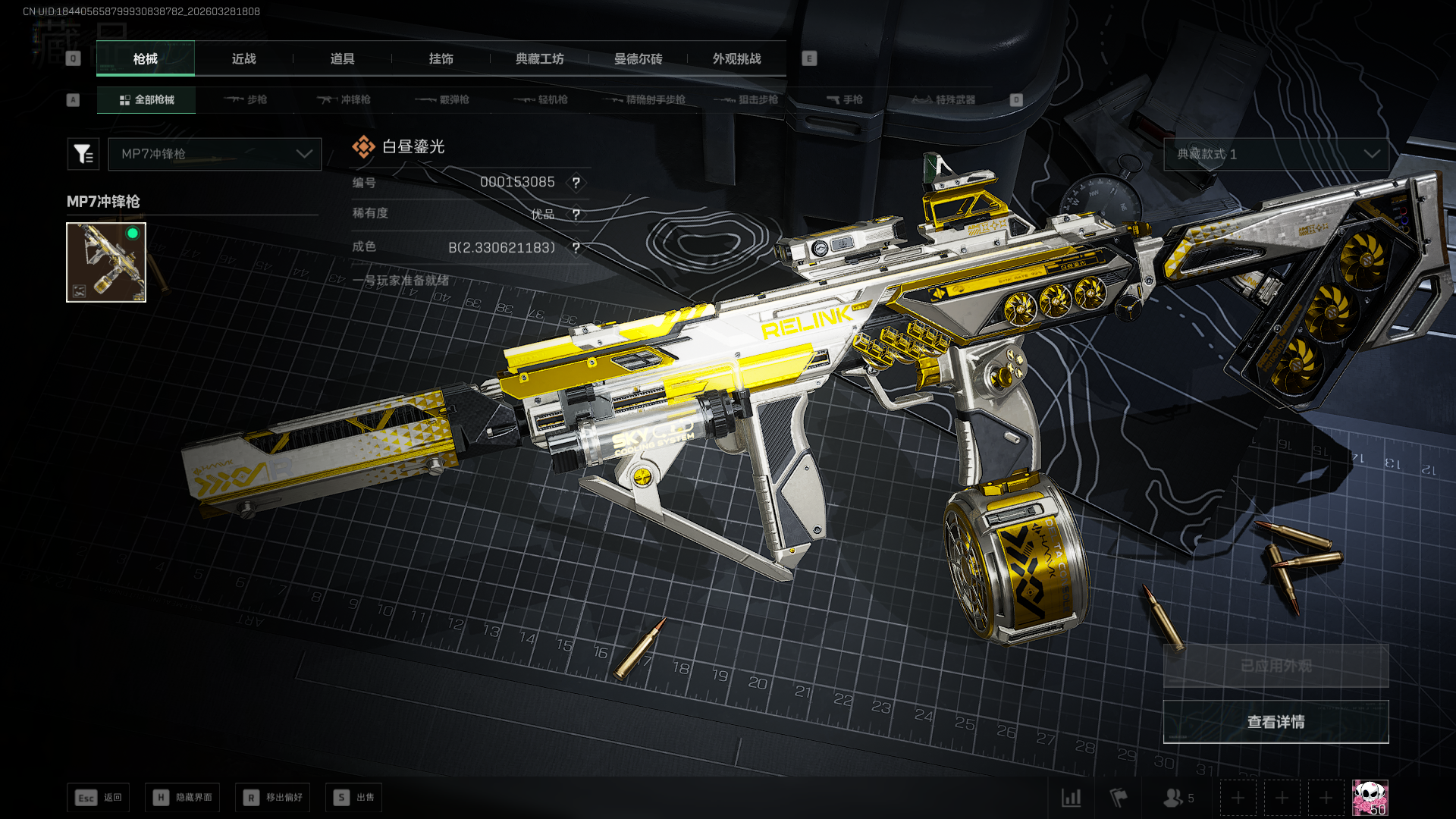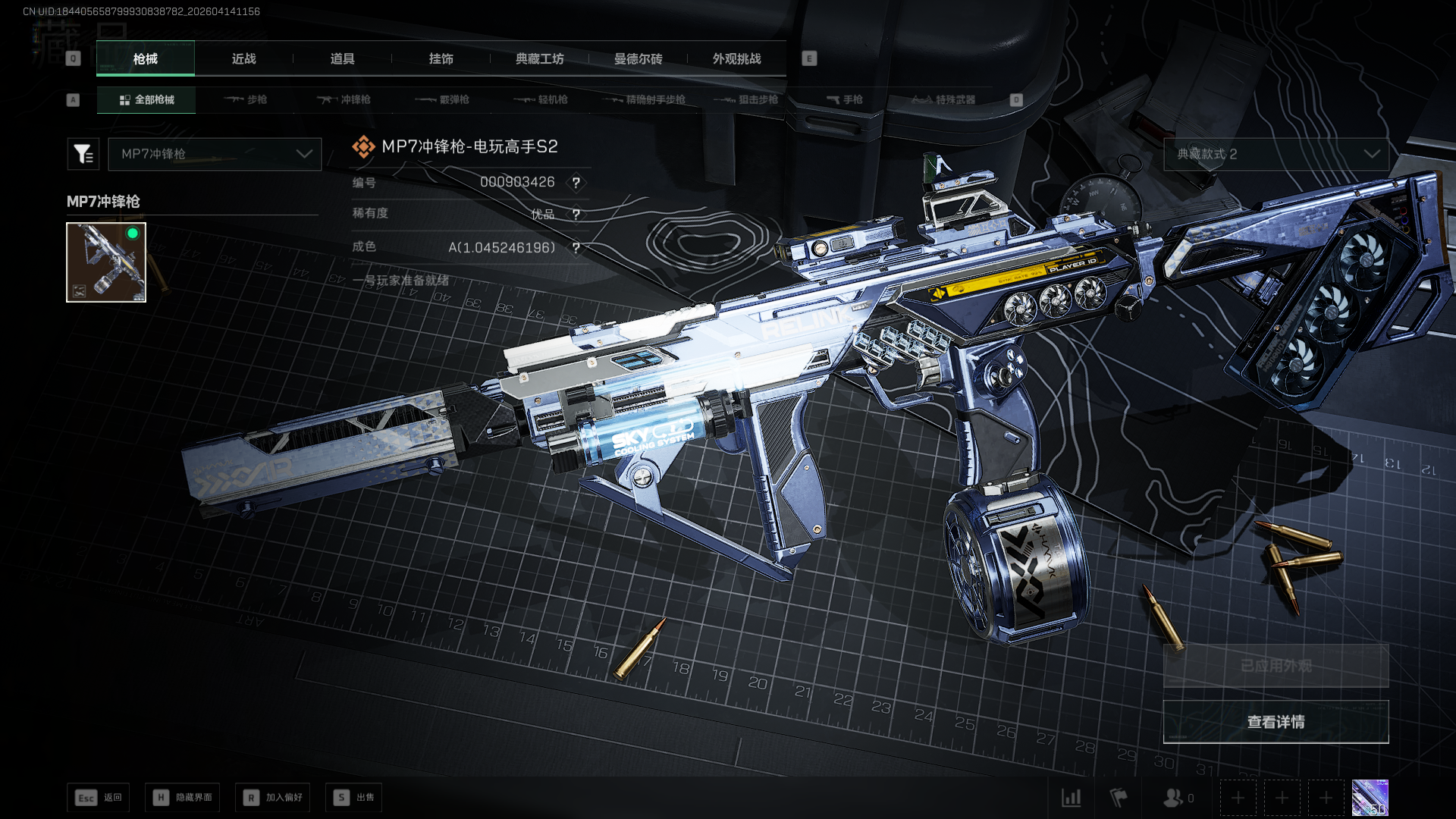 分享一下自用砖皮评测和看枪的小经验。主玩大战场,偶尔和朋友摸两把金,没事跑跑刀抽挂件UA蓝银(开砖)最近抽到的,赌极品大失败很喜欢MP7的动态机匣,换弹和瞄准时会像呼吸一样开合,曳光弹的星星特效和弹痕