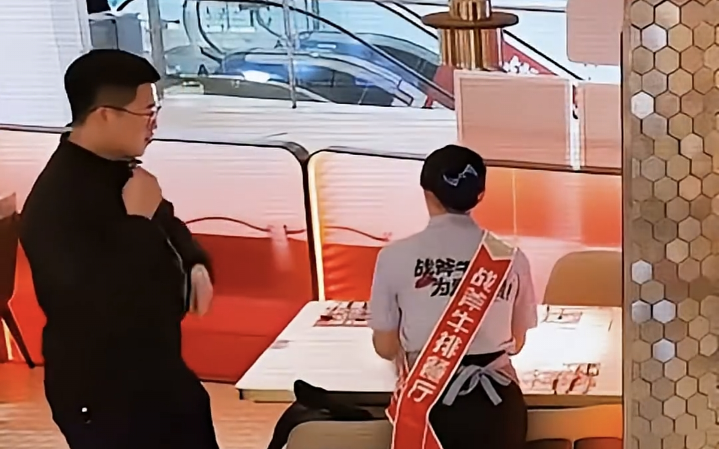 服务生: 还没点菜就脱衣你要干嘛呀?