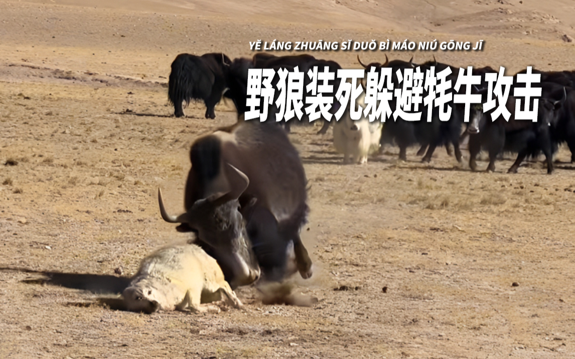 牦牛群撞击野狼瞬间,野狼竟直接躺地“装死”?没想到牦牛不依不饶