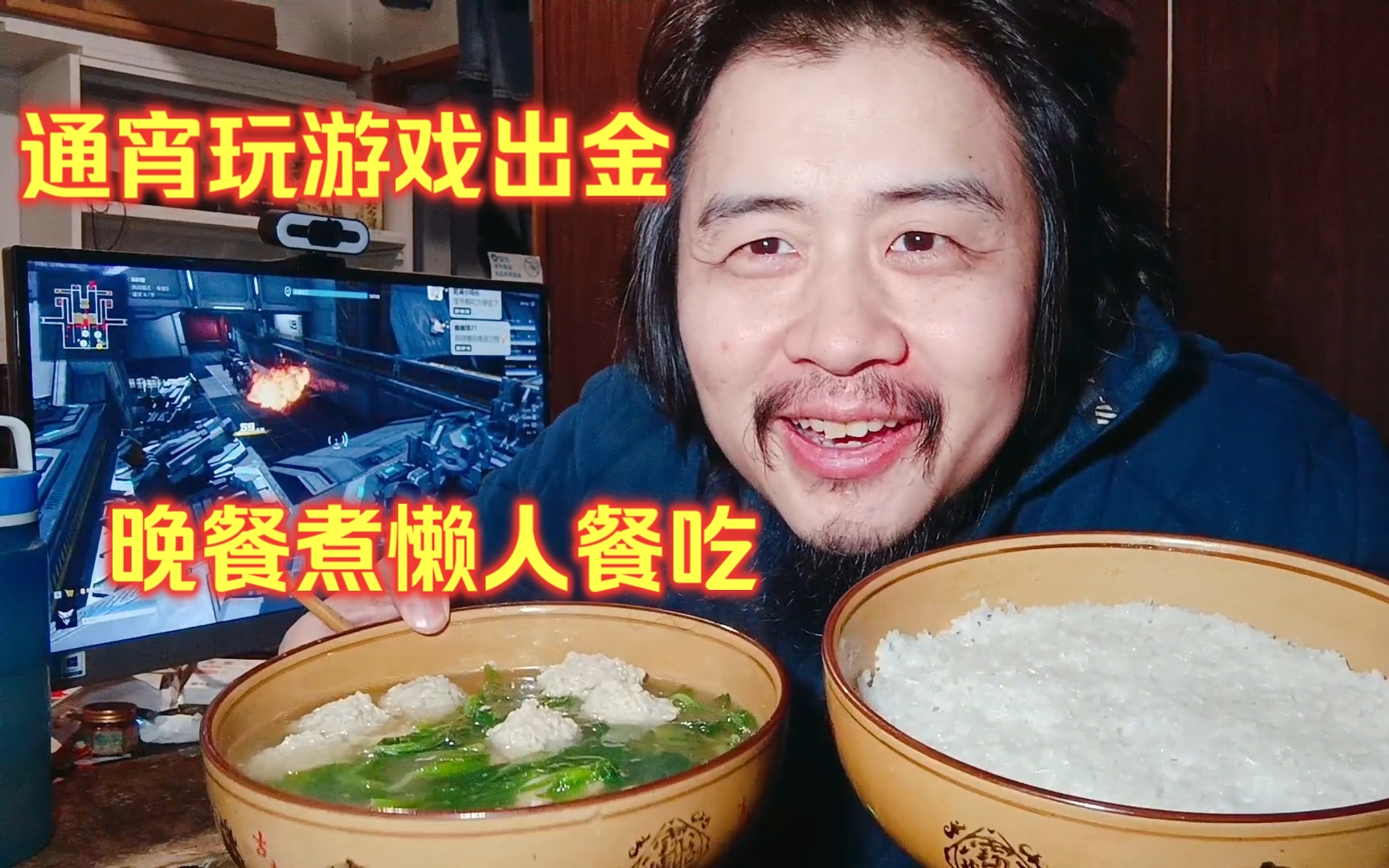 宅男独居生活,通宵玩游戏出金,晚餐煮懒人餐吃肉丸子豌豆尖汤配米饭