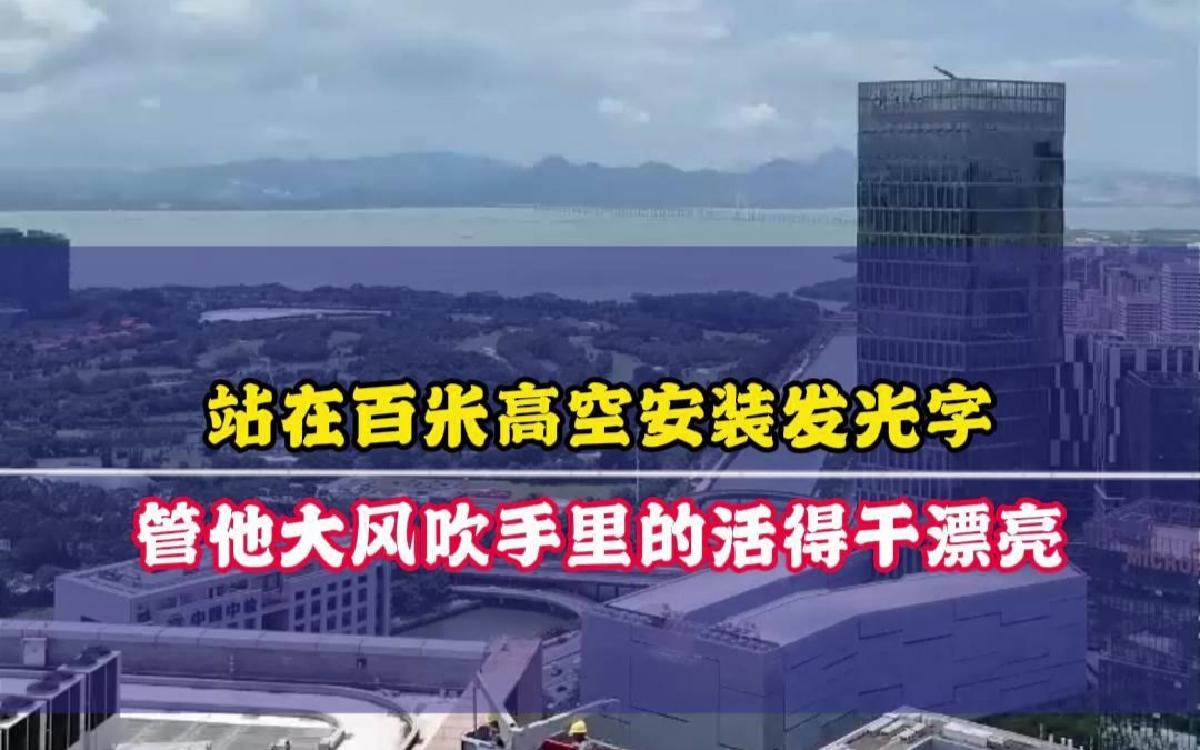 站在百米高空安装发光字管他大风吹手里的活得干漂亮